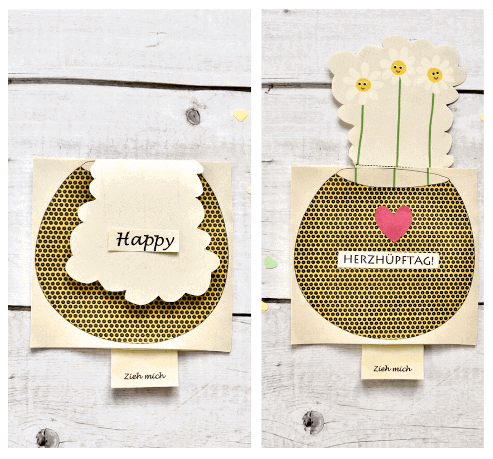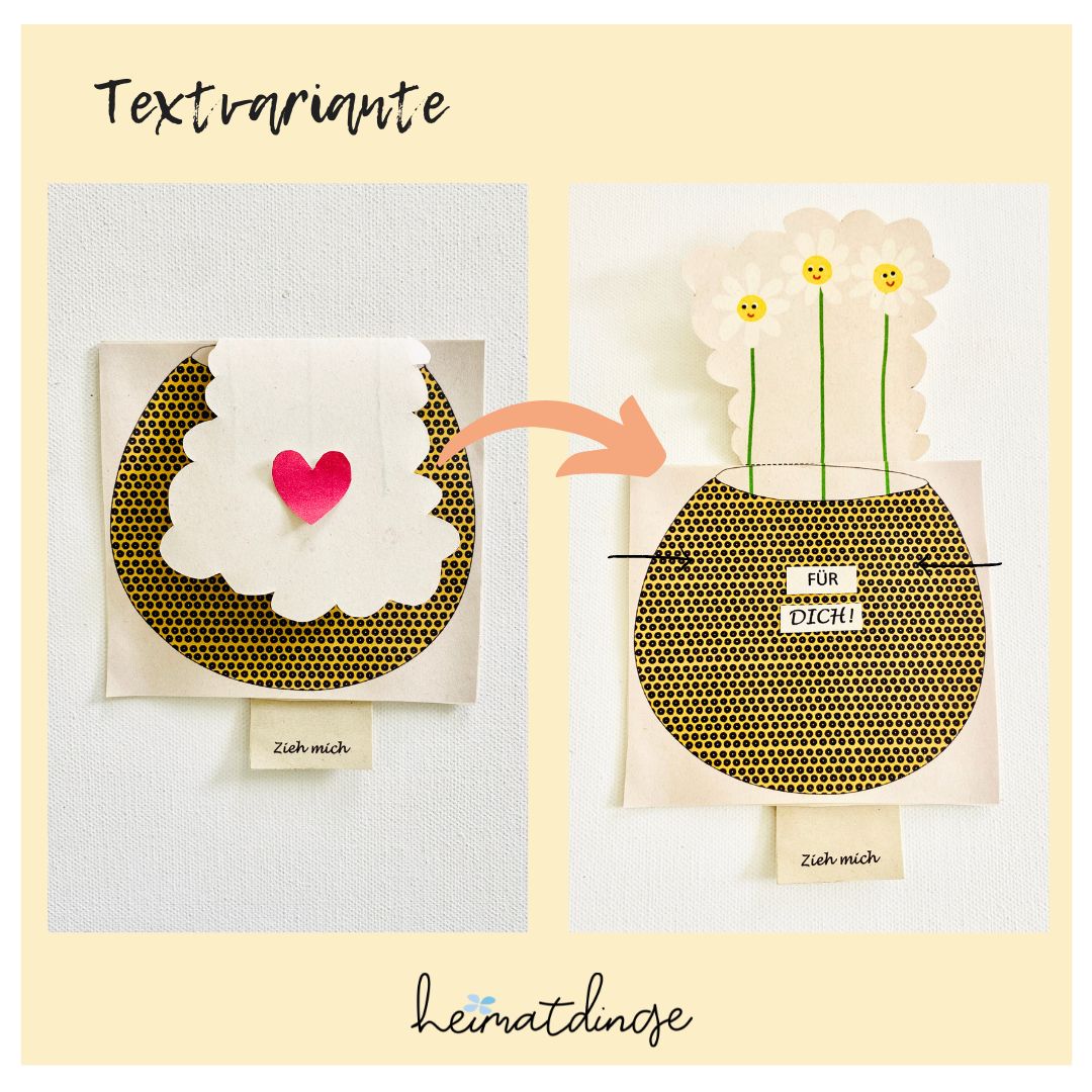 Mit dieser ganz besonderen, selbstgebastelten Glückwunschkarte kannst du Lieblingsmenschen eine tolle Überraschung bereiten. Hier macht nicht nur das Basteln Spaß, du schonst auch den Geldbeutel. Die PDF-Vorlage kann mit unterschiedlichen Texten versehen und damit beliebig oft verschenkt werden. Mit deinem persönlichen Text auf der Rückseite kannst du ganz individuelle Grüße an deine Herzensmenschen verschicken. Ob zum Geburtstag, zum Muttertag, zum Valentinstag oder einfach so, über diese liebevoll gebastelte Glückwunschkarte freut sich jeder. Ein Mal gezogen, und schwupps poppt ein kleiner Blumenstrauß auf.