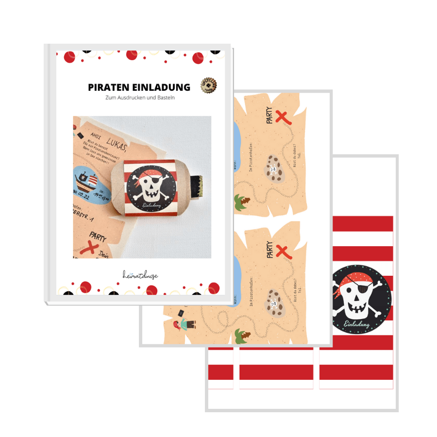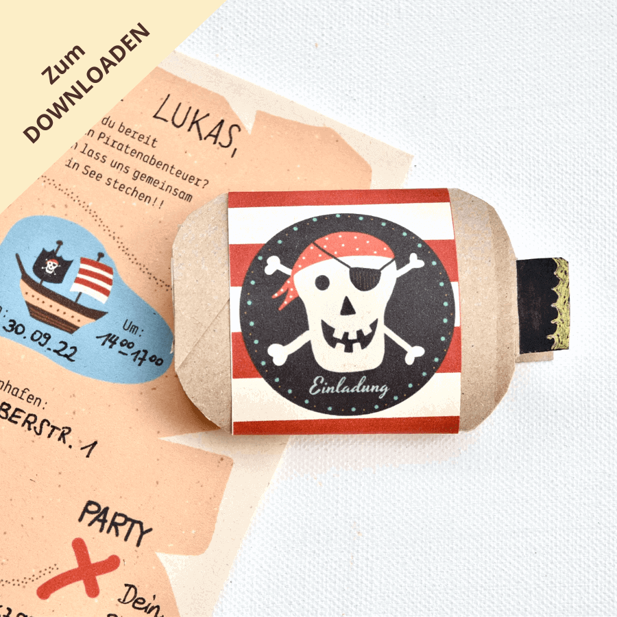 Lade dir die digitale Druckvorlage für diese einzigartige DIY Piraten Einladung jetzt herunter und mach‘ dich mit deinem kleinen Seeräuber ans Werk. Das gemeinsame Basteln für den Kindergeburtstag macht immer am meisten Spaß.