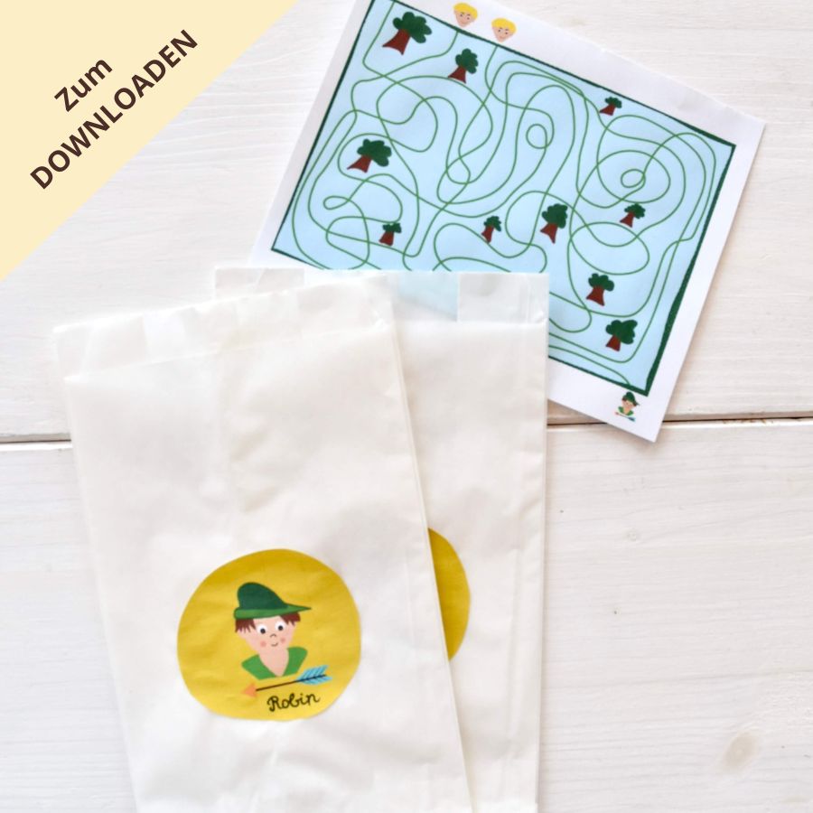 Robin Hood Mitgebseltüte: Etikett und Labyrinth als Mitgebsel zum Ausdrucken