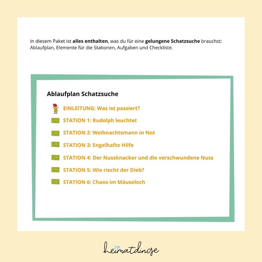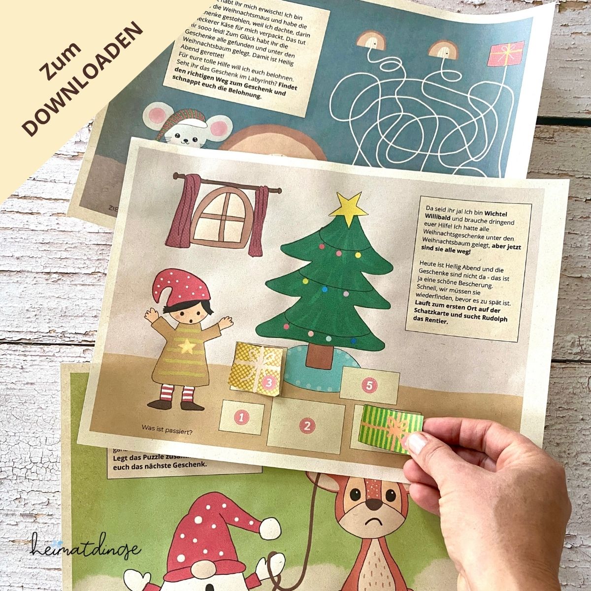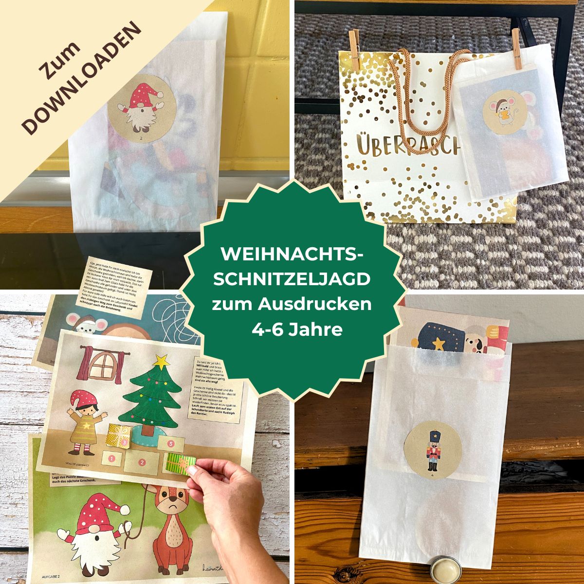 Die Weihnachtszeit ist für Kinder – gleich nach ihrem Geburtstag – die aufregendste und schönste Zeit des Jahres. Diese weihnachtliche Schnitzeljagd für drinnen und draußen und passt perfekt zu dieser magischen Stimmung und sorgt für unvergessliche Momente. Die Kinder entdecken Aufgaben und knifflige Rätsel, die zu kleinen Geschenken oder zur großen Überraschung führen. Ob als Highlight auf dem Kindergeburtstag, als besondere Kindergarten-Aktivität in der Adventszeit oder als Kinderbeschäftigung an den Weihnachtstagen. Ideal für Familien mit kleinen Kindern – spannend genug, aber nicht zu lange. So wird aus der Wartezeit aufs Christkind ein ganz besonderes Abenteuer voller Spaß und Weihnachtszauber. Die Vorbereitung ist kinderleicht: schneiden, kleben und ein bisschen basteln – fertig!